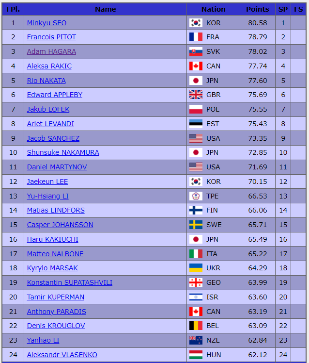 Najlepšie ohodnotený program predviedol Minkyu Seo. Kórejčan vo svojom programe výraznejšie nechyboval. Ako jediný prekročil hranicu 80 bodov, keď získal 80.58 bodov. Druhé miesto obsadil Francúz. Francois Pitot si vyjazdil 78.79 bodov.
