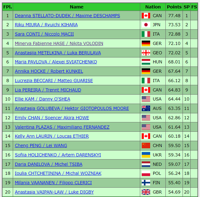 Priebežná druhá priečka patrí Japoncom Riku Miurovej a Ryuichimu Kiharovi. Obhájci majstrovského titulu boli za čistý program ohodnotený 73.53 bodmi. Tretí najlepší krátky program predviedli na ľade Sara Contiová a Niccolo Macii. Talianska dvojica za svoj výkon získala 72.88 bodov.