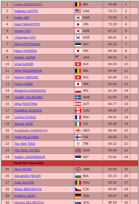 Druhé miesto po krátkych programoch patrí Isabeu Levitovej. Američanka si vyjazdila 73.73 bodov. Na 17-ročnú krasokorčuliarku stráca tretia Haein Leeová len pár desatín bodu. Kórejka bola ohodnotená 73.55 bodmi.
