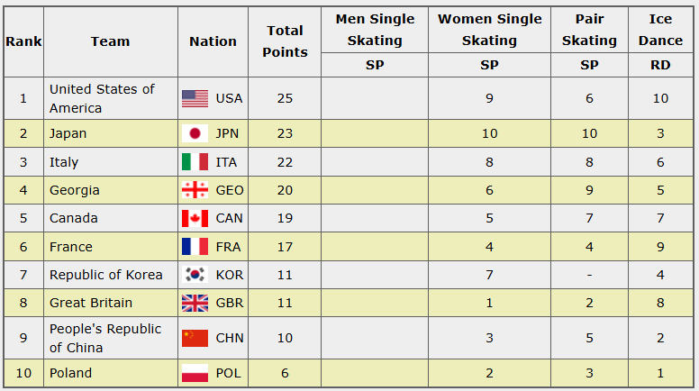 Keď im za skvelý výkon porota nadelila 76.65 bodov. Zásluhou Lari Naki Gutmannovej, ktorá predviedla bezchybný krátky program, ktorí jej vyniesol 71.62 bodov získali Taliani na domácom ľade v súčte 22 bodov.
