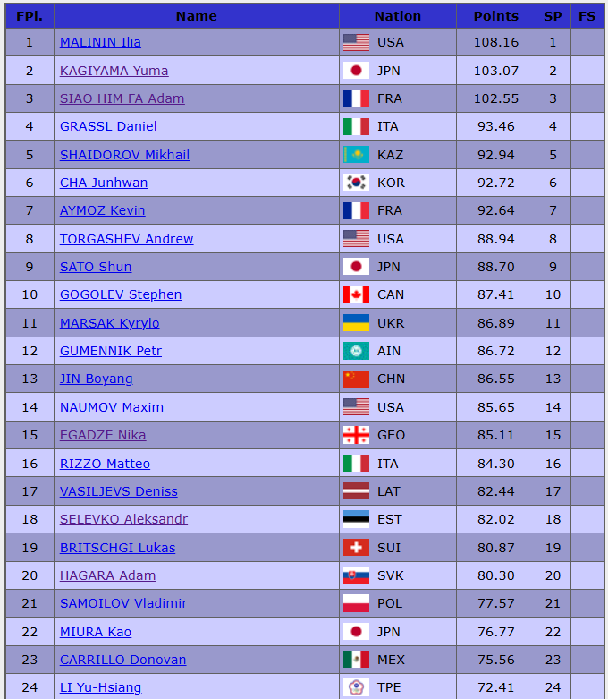Krátke programy mužov opanoval Američan Ilia Malinin. 21-ročný krasokorčuliar predviedol technicky náročnú, bezchybnú jazdu doplnenú o skvelé spojovacie prvky. Porota mu nadelila najvyššiu známku v podobe 108.16 bodov.