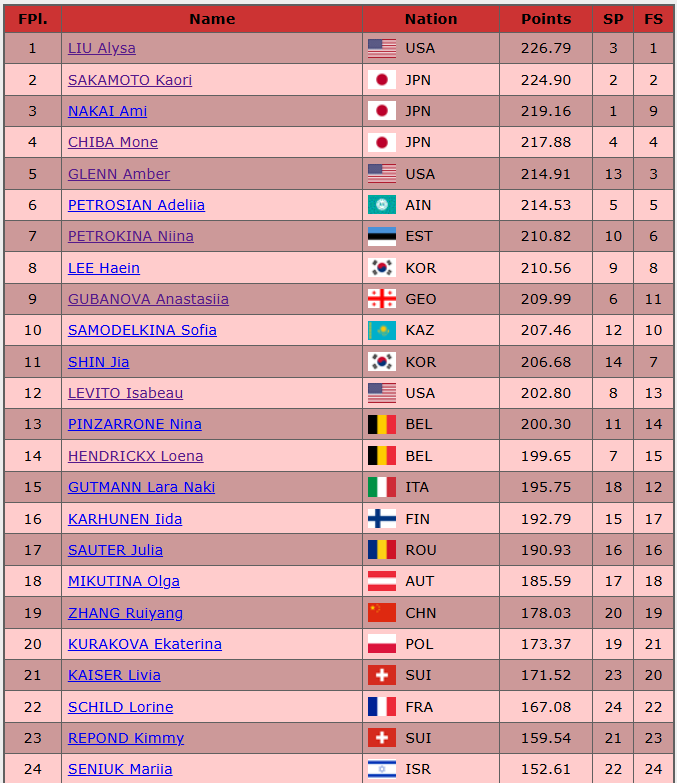 Tretie miesto dnes patrilo Ami Nakaiovej. Len 17-ročná Japonka zvládla tlak veľmi dobre, keď uzatvárala celú súťaž. Na úvod voľnej jazdy zaradila čisto skočeného trojitého axla. Následne prišli drobné chyby. Jej výkon vo voľnej jazde bol s 140.45 bodmi až deviaty najlepší. Náskok s krátkeho programu jej v konečnom zúčtovaní 219.16 bodov vyniesol medailu bronzového lesku.